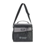 Dual zippered opening to main compartment. Side mesh pocket for water bottle and other belongings. Front zippered pocket for additional storage. Adjustable shoulder strap. Top grab handle. PVC free. Phthalate free. 14 can capacity.