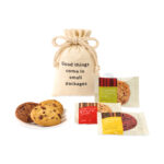 They say good things come in small packages which is certainly the case with this sweet little gift bag filled with a trio of individually wrapped soft baked cookies. A mug stuffer, a welcoming gesture or a promotional perk that tastes great this checks all the boxes. Includes three J&M cookies; Brownie, Chocolate Chip and Oatmeal Cranberry. Food contents may vary from what is shown, based on available inventory a substitute of similar or greater value will be used.